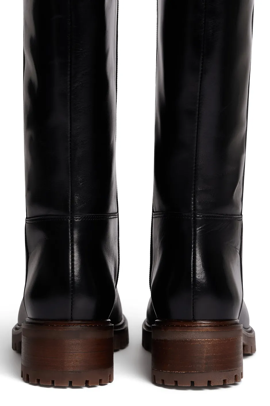 Classique du vestiaire chaussant qui vient finaliser nos looks dès l’automne, les bottes hautes Phoebe se portent version cuir lisse à semelle crantée contrastée pour un look contemporain. Alliées mode à porter de jour comme le soir, vous foulerez le pavé avec style. • Bottes hautes en cuir lisse • Semelle et talon crantés contrastés • Coloris Noir : un noir chic et intemporel • Dessinées à Paris par notre styliste • Cuir de qualité en provenance d’Italie • Fabriquées au Portugual • Hauteur tige : 38,5 cm • Hauteur talon : 4,5 cm • Livrées avec un pochon de voyage