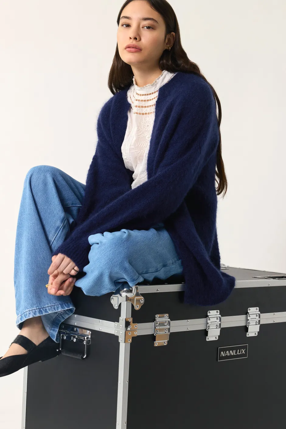 Réchauffez vos looks d’hiver avec le gilet long Altea en kid mohair. Classique du vestiaire stylisé de manches ballon et revu dans un volume généreux, portez-le comme un manteau dès l’entrée de saison. • Gilet boutonné volume large • Manches longues • Emmanchures décalées • Encolure V profonde • Poches plaquées • Finitions en bord-côte • Gilet en maille réalisé en fil italien du groupe « Moelleux » en Kid Mohair et laine mérinos certifiée sans Mulesing. Fil gonflant, chaud, très doux et duveteux. • Coloris Marine : un bleu nuit intense • Modèle dessiné à Paris par notre styliste • Longueur : 70 cm pour une taille 1 • Sofia mesure 1m70 et porte une taille 1 • Conseil style : sur une robe ou avec un pantalon habillé, il s’adapte à toutes vos envies
