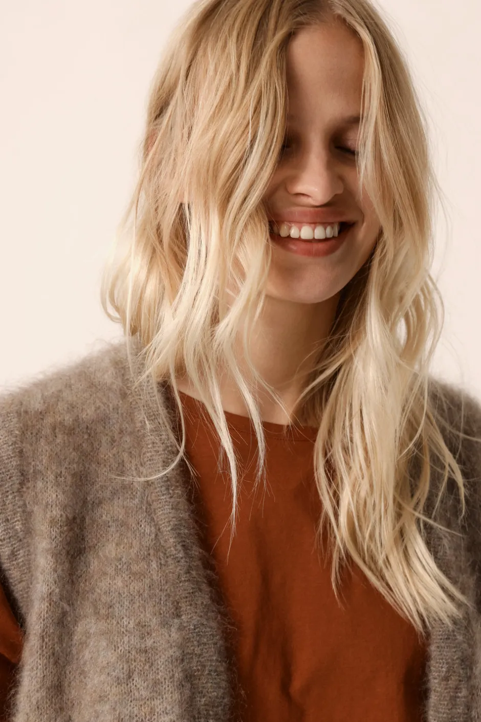 Modèle plebiscité l’hiver dernier pour son look vintage et sa versatilité, le gilet sans manches Bunny est décliné dans de nouveaux coloris. Porté sur une robe ou un t-shirt avec un jean large, il vous accompagnera tout au long de la saison.• Gilet sans manches• Coupe droite bord à bord• Encolure V• Finitions en bord-côte• Gilet réalisé en fil italien composé de Kid Mohair et laine mérinos provenant de fermes certifiées sans mulesing. Ce fil est gonflant, chaud, très doux et duveteux. Ce mélange crée une maille douce et chaude.• Coloris Marmotte : un beige foncé chiné• Modèle dessiné à Paris par notre styliste• Longueur : 60 cm pour une taille 1• Jolien mesure 1m76 et porte une taille 1• Conseil style : portez-le sur la robe longue Solange ou avec un t-shirt blanc et le jean Louela