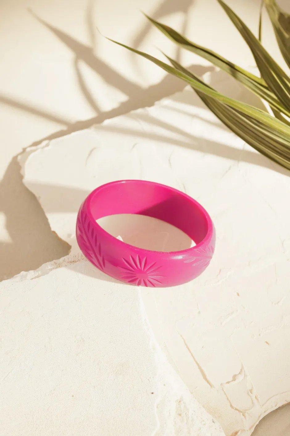 Ce bracelet jonc plaira à toutes les amatrices de bijoux vintage. En acétate brillant joliment gravé et décliné aux couleurs de la collection de vêtements, accordez-le à vos bracelets préférés pour sublimer votre poignet. • Jonc en acétate arrondi • Palme et soleil gravés • Finition brillante • Ce bracelet s’enfile et existe en taille unique • Ø 6,5 cm – Largeur : 1,5 cm • Livré avec un pochon de rangement