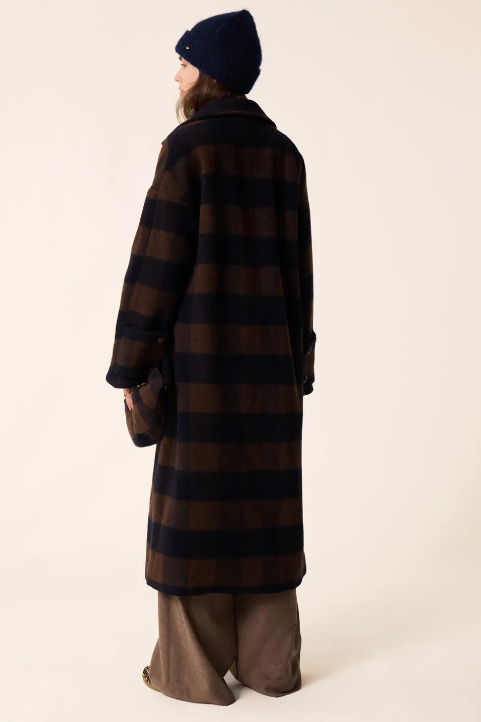 Exit le classique manteau noir, cet hiver le manteau long Yvie voit les choses en grand avec ses larges manches et ses carreaux oversize. En laine chaude et couvrante et boutonné pour un look rétro graphique, ce modèle à la fantaisie travaillée sera assurèment la pièce maîtresse de votre garde-robe. • Manteau long à carreaux en laine • Manches larges à patte de boutonnage • Col chemise • Poches passepoilées • Ouverture boutonnée • Tissu italien chaud et couvrant • Imprimé exclusif Des Petits carreaux « Moero », des carreaux oversize bleu marine et marron • Modèle dessiné à Paris par notre styliste • Longueur : 119 cm pour une taille 1 • Kryzia mesure 1m70 et porte une taille 1 • Conseil style : portez-le ouvert sur le pull Berton avec le jean Lulu et les bottines Papilla
