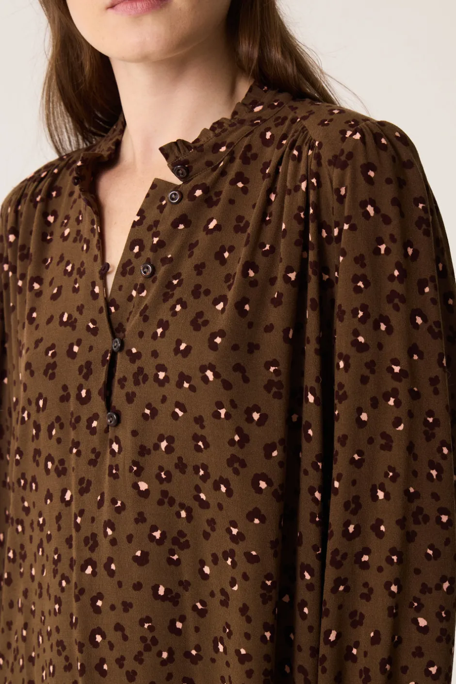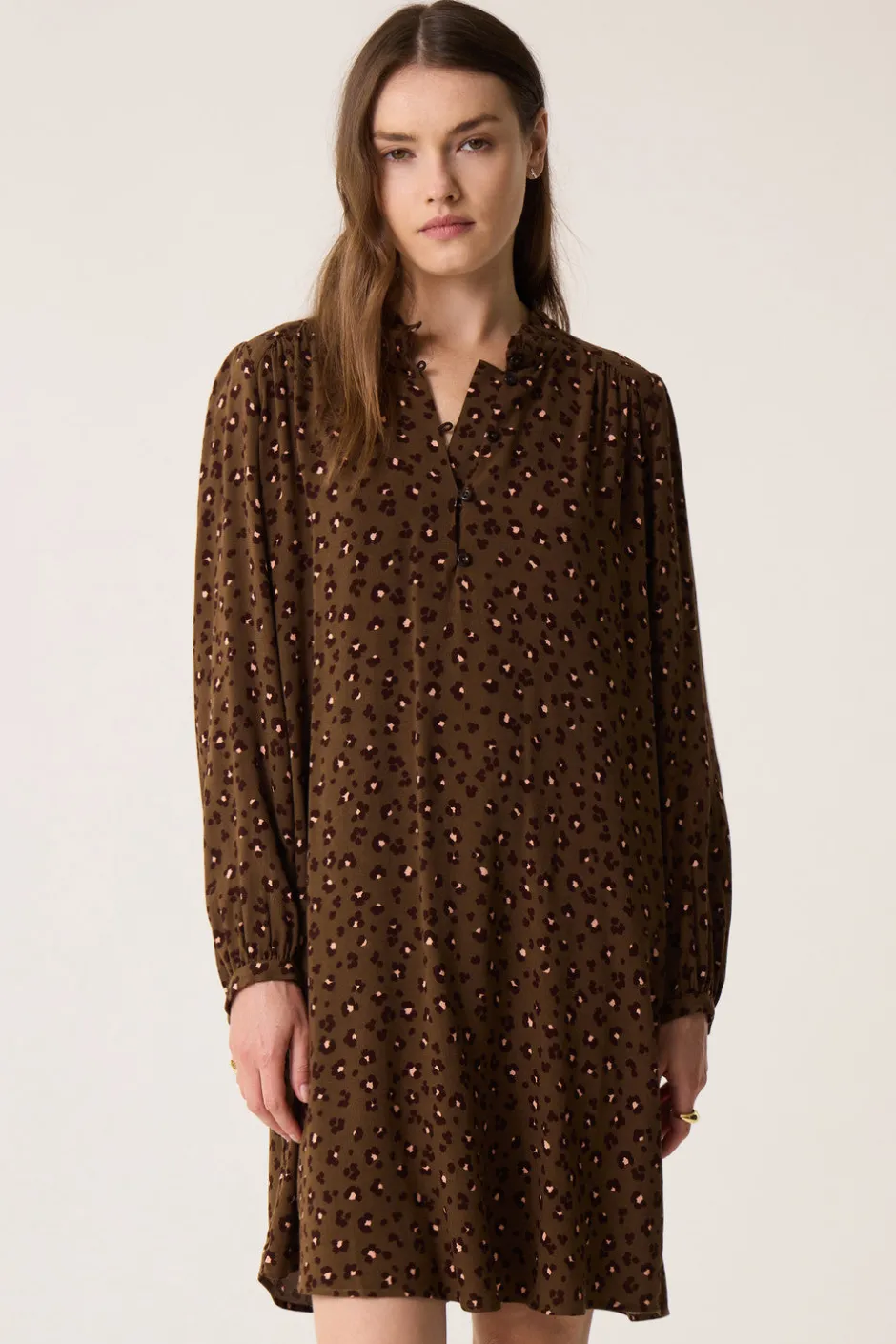 Viscose fluide et légère, originalité d’un motif léopard modernisé, la robe manches longues Solene adopte une coupe…