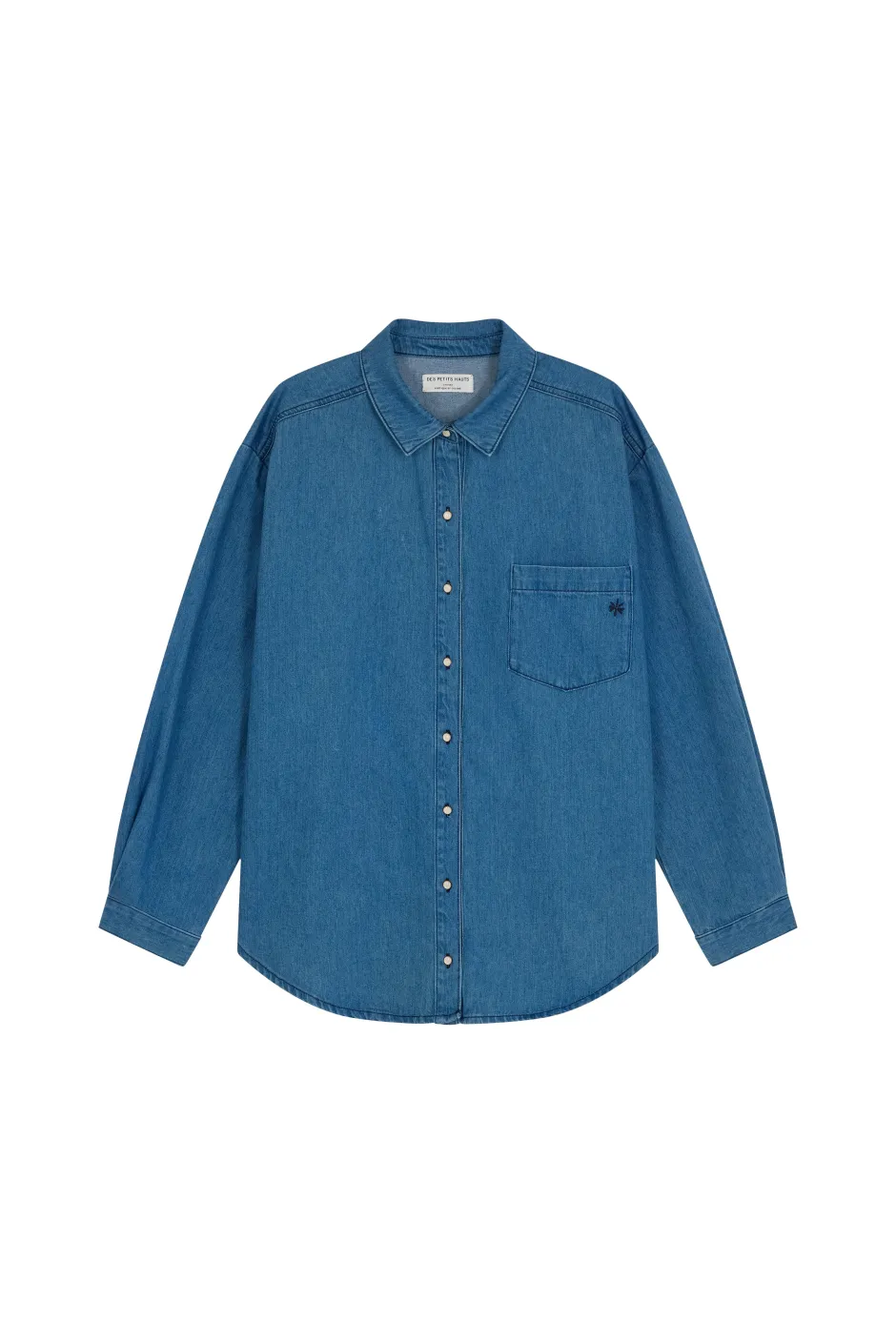 Cet automne, la surchemise se porte coupe oversize pour un look résolument contemporain. Détrônant la classique veste en jean bleu avec ses poches worker et ses coloris inédits, c’est la parfaite veste d’entrée de saison. • Chemise en jean oversize • Poche plaquée sur poitrine • Broderie signature « Éclat » sur poche » • Ouverture boutonnée • Chemise éco délavée • Coloris Middle Blue : un bleu jean lumineux • Modèle dessiné à Paris par notre styliste • Longueur : 68,5 cm pour une taille 1 • Sofia mesure 1m70 et porte une taille 1 • Conseil style : portez-la sur un t-shirt imprimé avec le jean Louisette et des runnings pour un look 00’s • La ligne de denim est travaillée en collaboration avec une spécialiste du denim éco-conçu