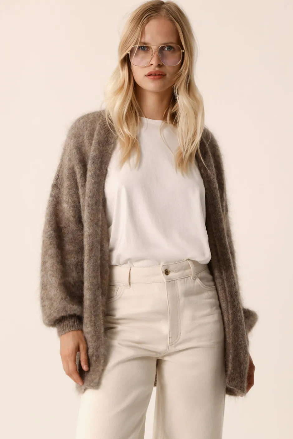 Réchauffez vos looks d’hiver avec le gilet long Altea en kid mohair. Classique du vestiaire stylisé de manches ballon et revu dans un volume généreux, portez-le comme un manteau dès l’entrée de saison. • Gilet boutonné volume large • Manches longues • Emmanchures décalées • Encolure V profonde • Poches plaquées • Finitions en bord-côte • Gilet en maille réalisé en fil italien du groupe « Moelleux » en Kid Mohair et laine mérinos certifiée sans Mulesing. Fil gonflant, chaud, très doux et duveteux. • Coloris Marmotte : un beige foncé chiné • Modèle dessiné à Paris par notre styliste • Longueur : 70 cm pour une taille 1 • Jolien mesure 1M76 et porte une taille 1 • Conseil style : sur une robe ou avec un pantalon habillé, il s’adapte à toutes vos envies