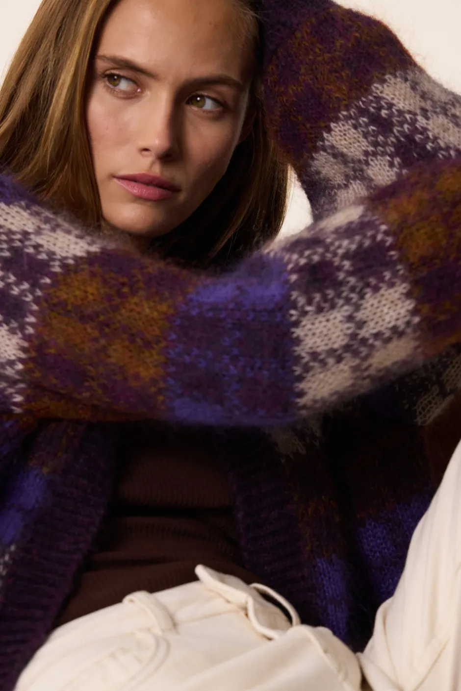 Plus original qu’un gilet uni et tout aussi confortable, cette saison le gilet sort des sentiers battus et se porte version jacquard à carreaux pour un look chic et vintage. Légèrement oversize, coupe bord à bord et encolure ronde, les motifs sont bel et bien au programme de la saison avec le modèle Azelia. • Gilet bord à bord en jacquard à carreaux • Encolure ronde • Emmanchures décalées • Finitions en bord-côte • Gilet réalisé dans un nouveau fil italien du groupe « Fancy Mohair » composé de mohair d’Afrique du Sud et de laine d’Australie. Ce fil est chaud et a un aspect duveteux. • Coloris Multicolore : des carreaux violet, écru et marron • Modèle dessiné à Paris par notre styliste • Fabriqué en Italie • Longueur : 55 cm pour une taille 1 • Alessandra mesure 1m74 et porte une taille 1 • Conseil style : portez-le avec un t-shirt manches longues, le jean Lulu et les bottines Papilla