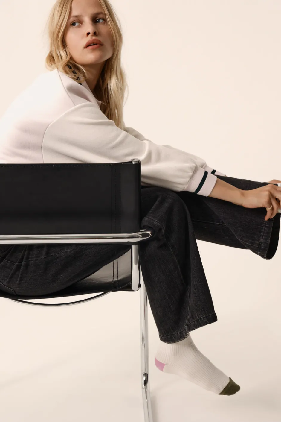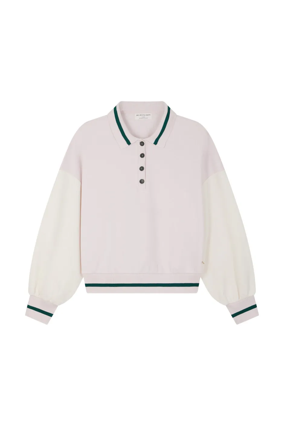 Look color block, volume oversize et coupe courte, le sweat Joeko ne lésine pas sur le style. Inspiration polo avec son col boutonné et ses finitions en bord-côte rayé, ce modèle résolument 90’s signe le retour des silhouettes casual sport. • Sweat oversize court • Col polo à patte boutonnage • Finitions en bord-côte à liseré contrasté • Molleton gratté intérieur doux et chaud • Coloris Crème et Arctique : un blanc crème et un rose pâle • Modèle dessiné à Paris par notre styliste • Fabriqué au Portugal • Longueur : 55 cm pour une taille 1 • Jolien mesure 1m76 et porte une taille 1 • Conseil style : portez-le avec la jupe longue en jean Louria et des baskets